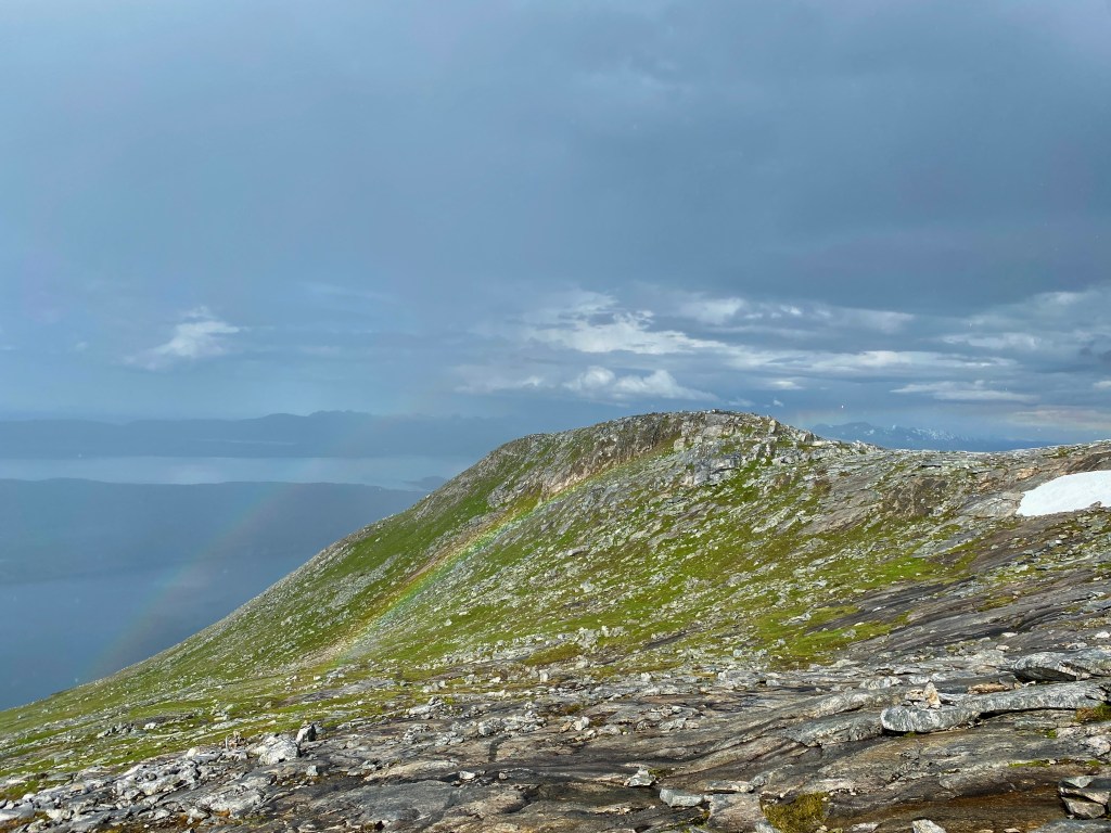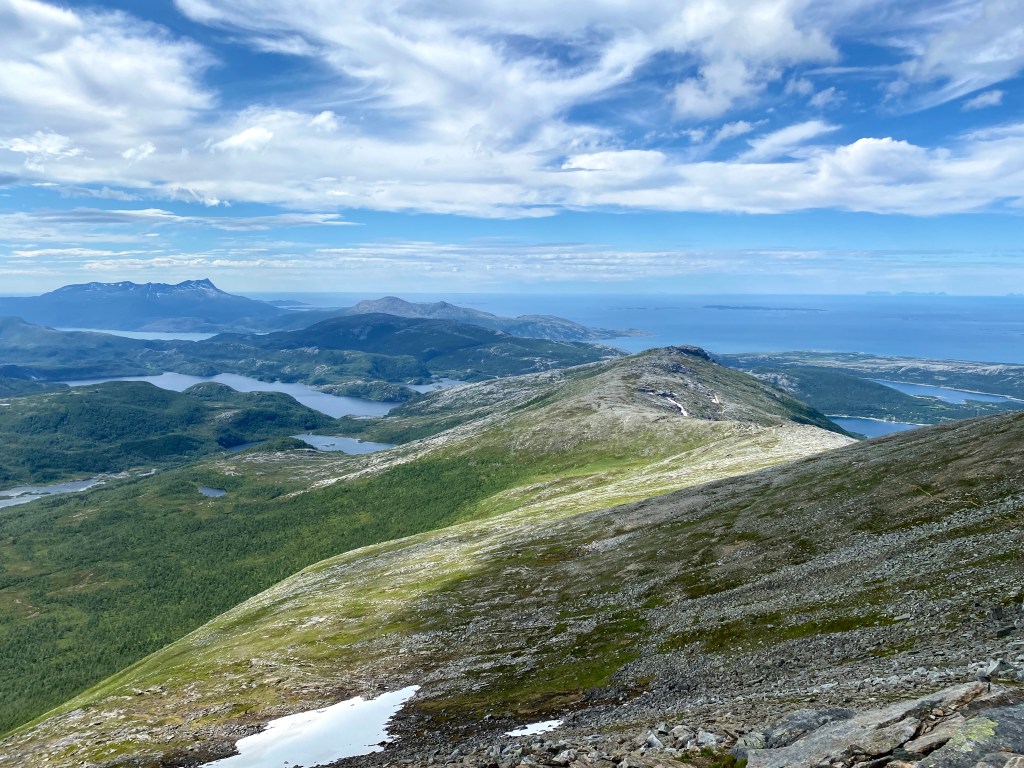 At some point we though that the mountain top over the snowfield was Per Karlsatind. But it turned out that it wasn’t. There were still a long way to go. About 45 minutes after our snow bath, we were able to see the mountains on the other side of the ridge.
